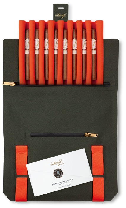 With innovation at its core, the Davidoff Travel Humidor ensures that cigars arrive at their destination in style and perfect condition. All humidors come with a smart tray exclusively created for Davidoff. With its innovative wave design, it can be flexibly adjusted to hold and safely transport up to eight cigars, depending on the format. Davidoff’s choice of materials protects the cigars from impact and ensures that the delicate cigar wrappers are well preserved. Laminated fabric, seamlessly welded components and a Boveda two-way humidity control pack maintain the ideal humidity inside the humidor for 45 days.