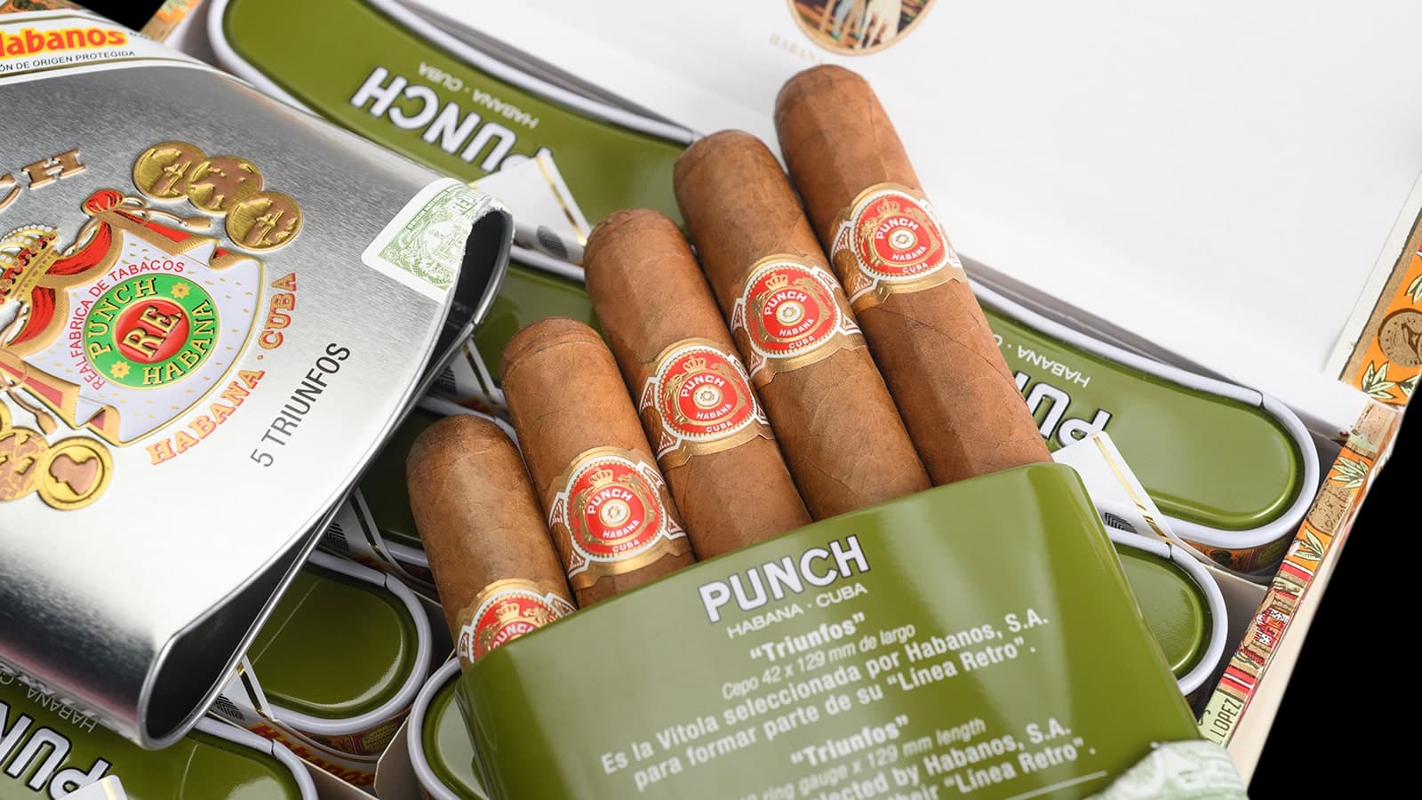 After Romeo y Julieta Club Kings, Partagas Capitols, H.Upmann Regalias, and Hoyo de Monterrey Souvenir de Luxe, the Punch brand has also received a Retro Line Habanos edition with the Triunfos. The Petit Corona format measures 42 x 129 mm (5 1/10″). The Punch Triunfos is offered in a color-coordinated aluminum box in a retro design with five cigars. They will be available from 05.03.2024 in the Swiss Casa del Habano and from 12.03.2024 in Habanos Specialist stores.